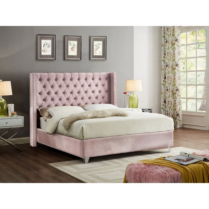 Seguro que te irás a la tierra de los sueños con estilo con esta cama con plataforma, una elección que combina siluetas tradicionales con detalles modernos y de moda. Hecha a mano de madera maciza, su silueta cuadrada se ve reforzada por alas inspiradas en el respaldo de las alas para una apariencia atrevida, mientras que los acentos con botones y las líneas de la cabeza de un clavo adornan la cuerda con un poco de encanto contemporáneo. La tapicería de terciopelo agrega otro toque de textura. Este diseño incluye un kit de listones, por lo que no es necesario un somier.