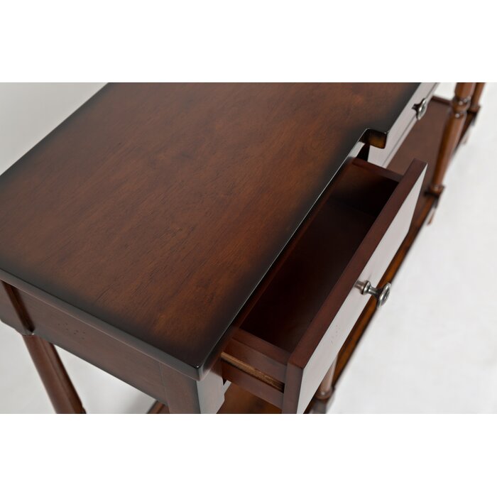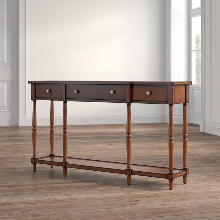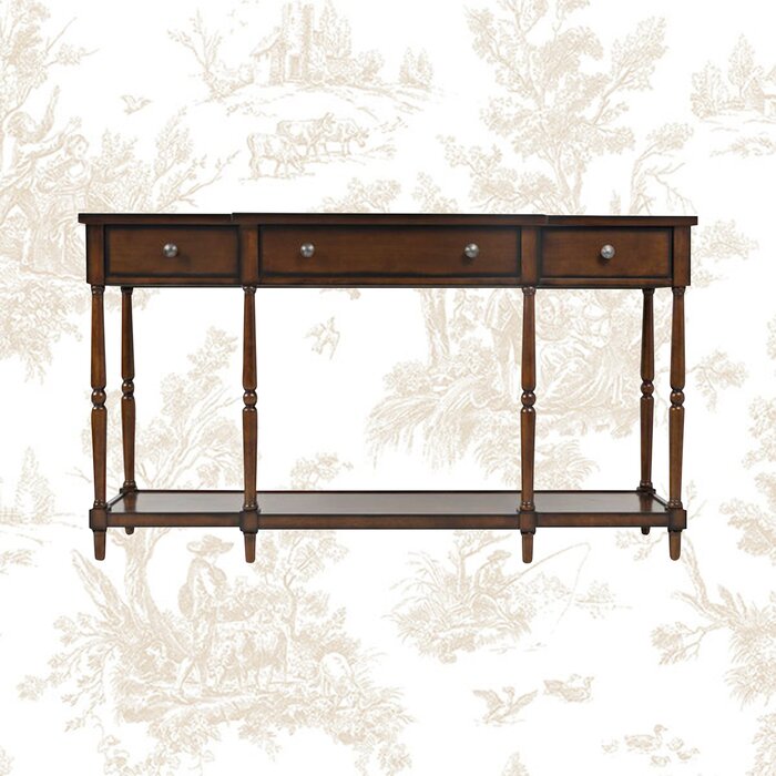 Decora y organiza tu entrada o sala de estar con estilo con esta consola. Está hecho de madera maciza de caucho y tiene un acabado en un tono neutro que combina con casi cualquier paleta de colores. Esta consola presenta tres cajones con detalles en la parte delantera del desayuno y se coloca sobre seis patas delgadas y torneadas para un atractivo tradicional. También hay un estante inferior para guardar cestas organizativas u objetos decorativos, dejando espacio en la parte superior para fotos familiares enmarcadas, una lámpara decorativa o un jarrón. Se requiere un montaje mínimo. Curado a mano por Kelly Clarkson.