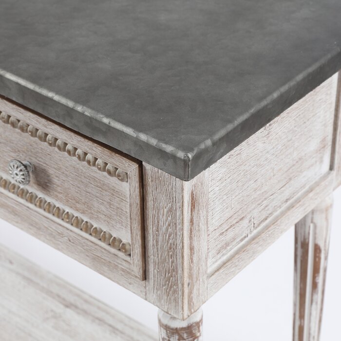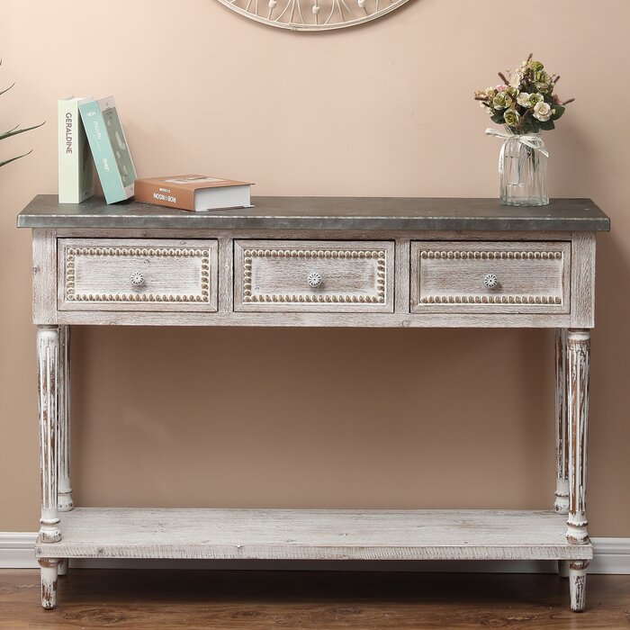 Completa tu sala de estar o entrada en estilo rústico francés con esta encantadora consola. Su marco de líneas limpias está hecho de una mezcla de madera sólida y de ingeniería, y presenta un aspecto rústico gracias a su acabado envejecido. Su amplia mesa rectangular se asienta sobre cuatro patas torneadas con detalles de madera tallada, y es un gran lugar para una lámpara o una suculenta. Los tres cajones cuentan con un borde de cabeza de clavo a lo largo del costado para darle un toque decorativo y se deslizan hacia afuera para acomodar correo, llaves y libretas de direcciones. Además, nos encanta que el estante abierto de abajo sea el lugar perfecto para marcos de fotos y candelabros votivos.