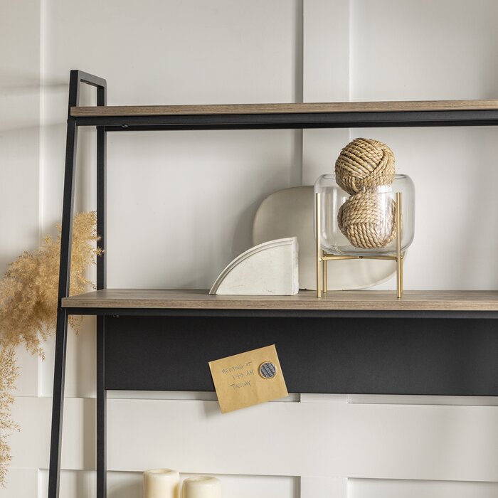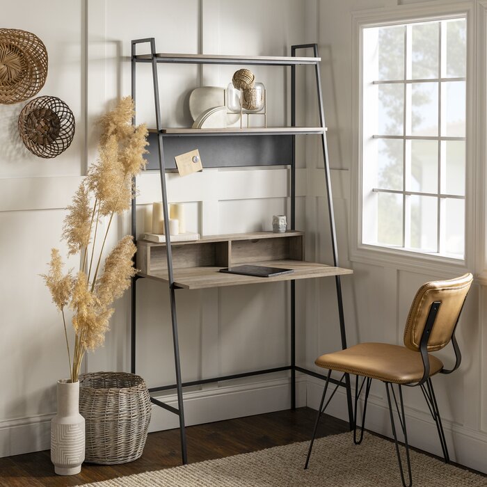 Este escritorio de escalera inclinado presenta un marco alto con lados abiertos y una espalda abierta. El escritorio central tiene un panel frontal abatible para que coloques tu computadora portátil, mientras que dos cubículos con cortes para administración de cables son ideales para guardar dispositivos electrónicos y accesorios. Completando el diseño, dos estantes superiores proporcionan plataformas perfectas para exhibir libros, fotos enmarcadas y curiosidades coleccionadas.