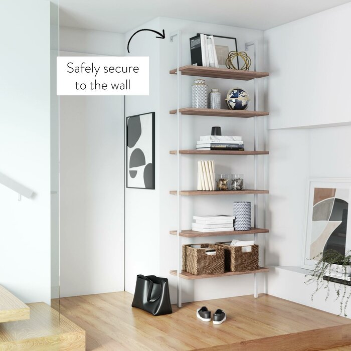 Esta encantadora y funcional estantería tipo escalera es una excelente manera de darle estilo industrial a la decoración de su granja. Está fabricado con un marco de metal abierto para un aspecto rústico y se monta en la pared para mantenerlo en su lugar. Seis estantes amplios hechos de madera de ingeniería con un acabado neutro brindan el lugar perfecto para libros, plantas, elementos esenciales de bar o cualquier otra cosa que desee exhibir. Monte esta pieza a gran escala en la pared de la oficina en casa, la sala de estar o el dormitorio para lograr un estilo elegante y que ahorre espacio. Además, el hardware de montaje en pared incluido facilita la instalación de esta estantería.