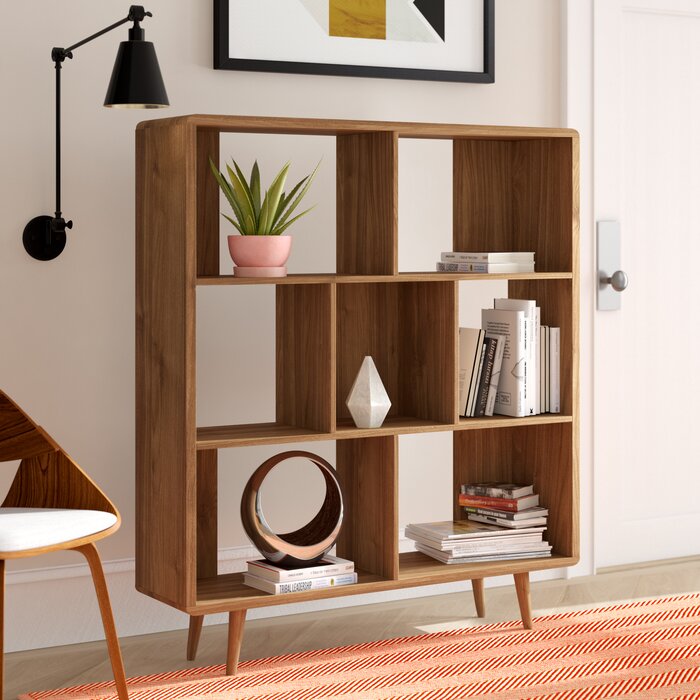 Equilibrando la forma con la función, este etagere es una pieza funcional que le ayuda a ordenar ya que le da a su conjunto un estilo moderno de mediados de siglo. Hecho de madera, se encuentra sobre patas extendidas y presenta una silueta cuadrada equipada con chapas de nogal. Los compartimentos cuadrados con paneles traseros abiertos actúan como escenarios elegantes para mostrar acentos decorativos, fotos familiares enmarcadas, libros y más.