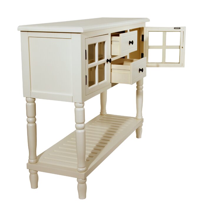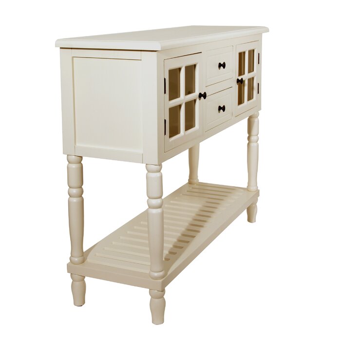 Consejo del estilista: tanto para guardar porcelana fina como para unir la decoración de su comedor, los armarios y aparadores son la pieza multiusos perfecta. Intente cubrir una con una variedad de plantas en macetas para una viñeta inspirada en el jardín, o muestre dulces y golosinas para un elegante postre para su próxima cena. Tome esta consola, por ejemplo, su estructura de madera manufacturada con patas torneadas tradicionales y un acabado sólido, mientras que un estante de tablillas, dos gabinetes con frente de vidrio y dos cajones agregan espacio de almacenamiento.