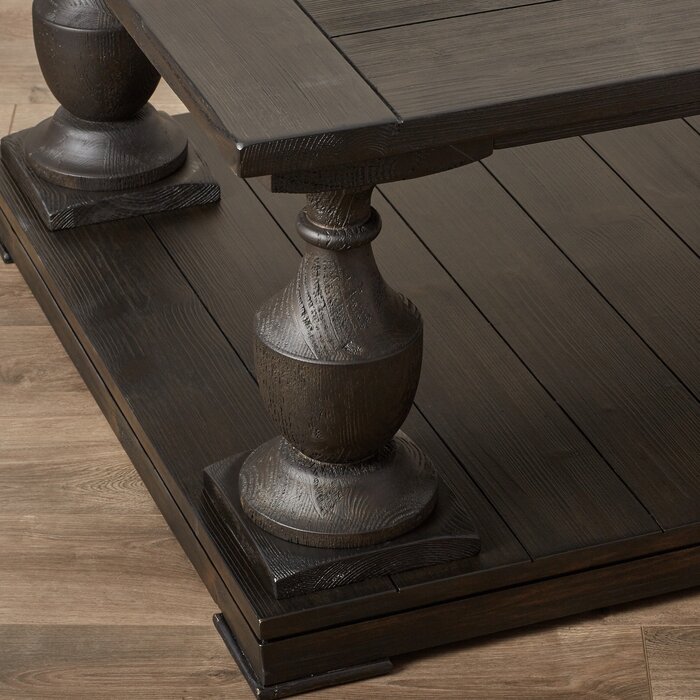 na pieza central en su sala de estar, su mesa de café le brinda el lugar perfecto para instalar una pantalla o simplemente mantener el control remoto al alcance, todo mientras complementa el estilo de su conjunto de asientos. Tome este, por ejemplo: hecho a mano de madera maciza, presenta cuatro patas torneadas y acabado Barnwood ahumado para una apariencia clásica con un toque de cabaña.