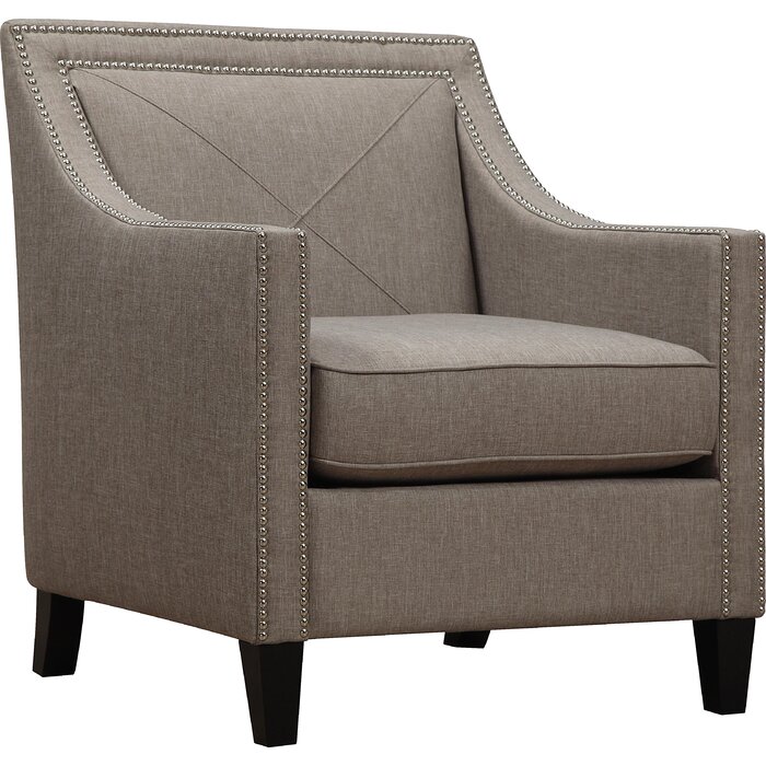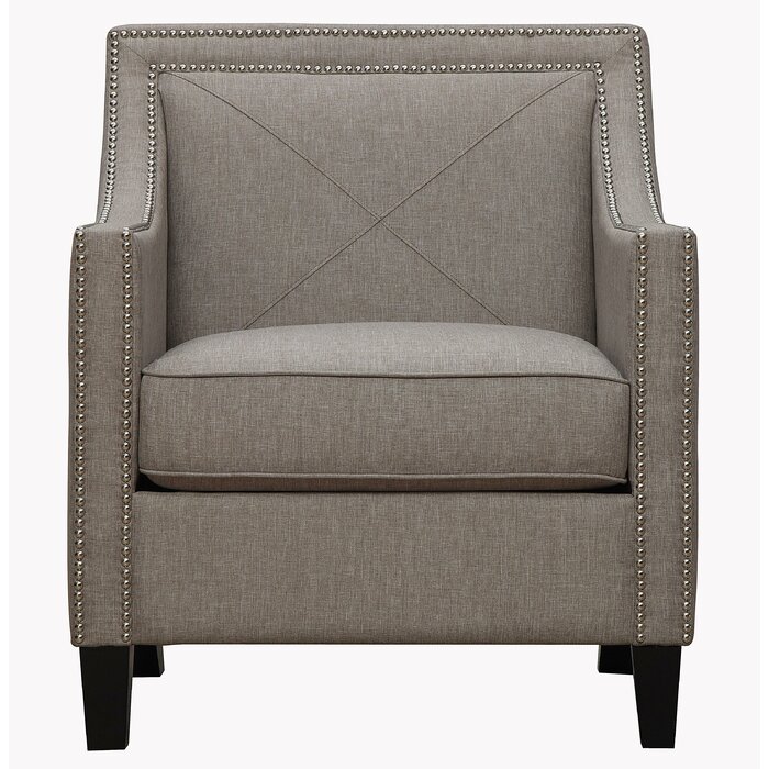 Agregue un toque de estilo a la sala de estar o la suite principal con este elegante sillón, que exhibe adornos plateados con cabeza de clavo y tapicería neutra. Combínalo con un sofá blanco, una mesa de centro de vidrio y una estantería de pared de líneas limpias para darle un toque de estilo contemporáneo.