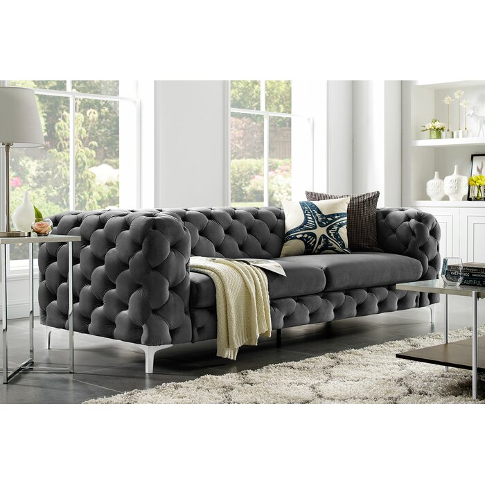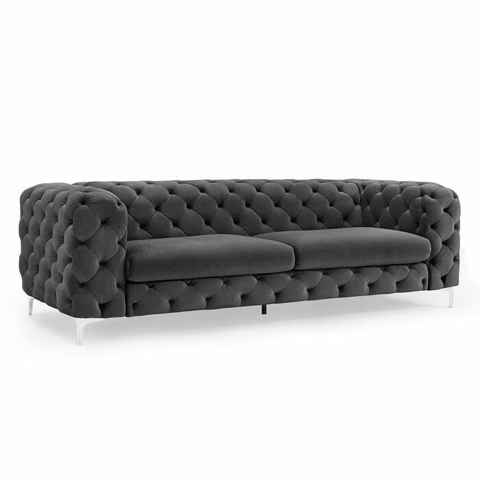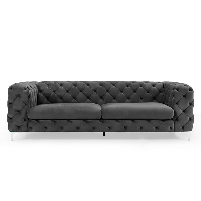 ¡Dale a tu sala de estar el toque perfecto, elegante, moderno y clásico de mediados de siglo! Con patas de acero inoxidable dorado brillante y tapicería de terciopelo con botones, le da a este sofá Chesterfield con detalles de cojín un aspecto moderno pero clásico. Este sofá no solo agrega un aire de clase alta a su hogar, sino que también brinda un lugar más cómodo para apoyarse y descansar