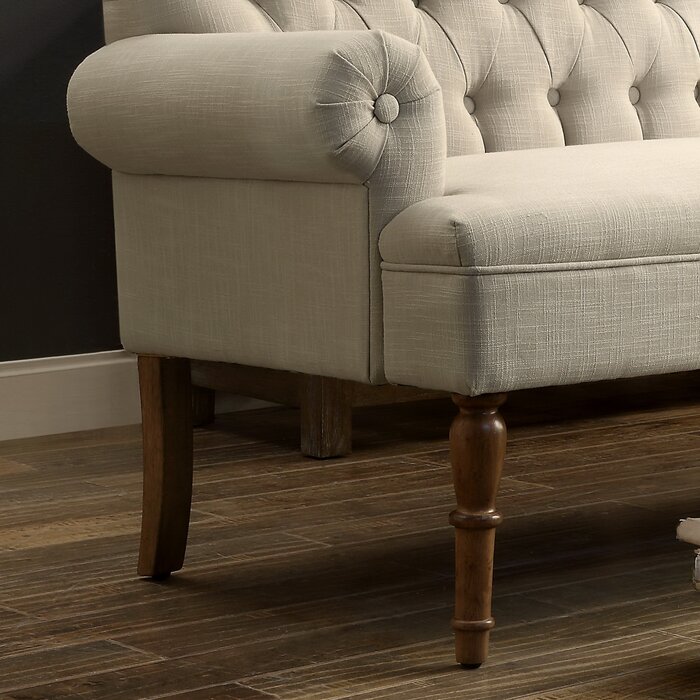 Este sofá es la elección perfecta para un conjunto de asientos a pequeña escala o un acento de dormitorio. Hecho de madera maciza de arce, ofrece un aspecto tradicional con brazos enrollados y patas torneadas acabadas en nogal. El acolchado de espuma y la suspensión de tela agregan comodidad al asiento, mientras que la tapicería 100% poliéster lo une todo con mechones de botones y un tono sólido neutro.