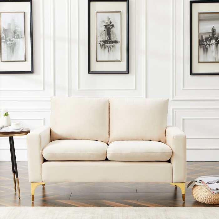 Este es un sofá de dos plazas del elegante estilo de diseño. Hecho a mano de madera maciza, se encuentra sobre patas de metal ahusadas y presenta un diseño de brazo de riel envuelto en tapicería de terciopelo de poliéster para una apariencia texturizada. le ofrece a usted ya sus invitados un lugar cómodo para sentarse, ya sea que esté charlando con un café o disfrutando de una maratón de películas.