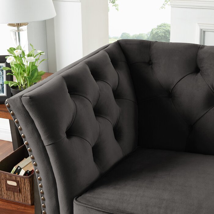 Mejore su juego de asientos con este elegante sofá. Construido con un marco de madera resistente que puede soportar hasta 900 libras distribuidas uniformemente y cubierto con tela 100% poliéster duradera y fácil de limpiar, este sofá está diseñado para resistir cualquier desafío que le plantee, ya sea huéspedes de la casa, niños o mascotas. Y aunque el sofá está hecho para durar, no escatima en estilo, con brazos ensanchados, un adorno de cabeza de clavo de cobre antiguo clavado a mano y mechones alrededor de la espalda y los brazos. Y la mejor parte es que el ensamblaje es muy fácil, simplemente coloque las patas y estará sentado en el regazo del lujo antes de que se dé cuenta.
