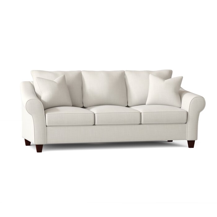 Este sofá presenta brazos abocinados, inclinados y enrollados con un borde de ribete. El respaldo acolchado se asienta muy por encima del riel trasero y sobre tres cojines de asiento con bordes limpios.
