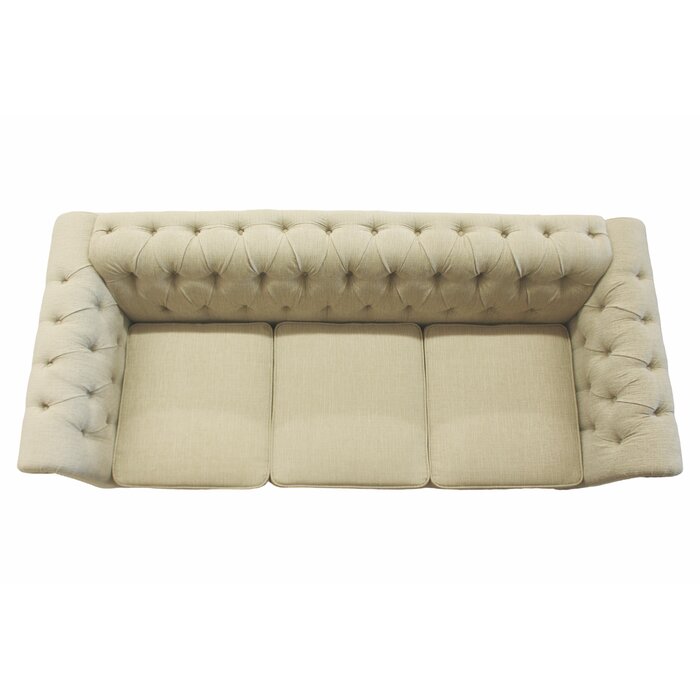 Este sofá hace una declaración y crea un espacio emocionante para su sala de estar con un verdadero estilo sofisticado. Este sofá ha hecho su aparición en clubes de caballeros de lujo, casas victorianas y más durante siglos; hoy. Este sofá ofrece una versión moderna de un clásico atemporal con sus brazos redondeados con mechones y el borde de la cabeza de un clavo. Su estructura de madera dura mixta está tapizada de lino envuelto con botones a lo largo de los brazos y el respaldo y patas de madera debajo. Además, el cojín del asiento se quita para facilitar el mantenimiento.