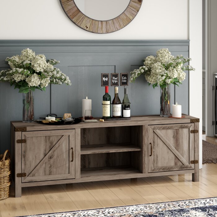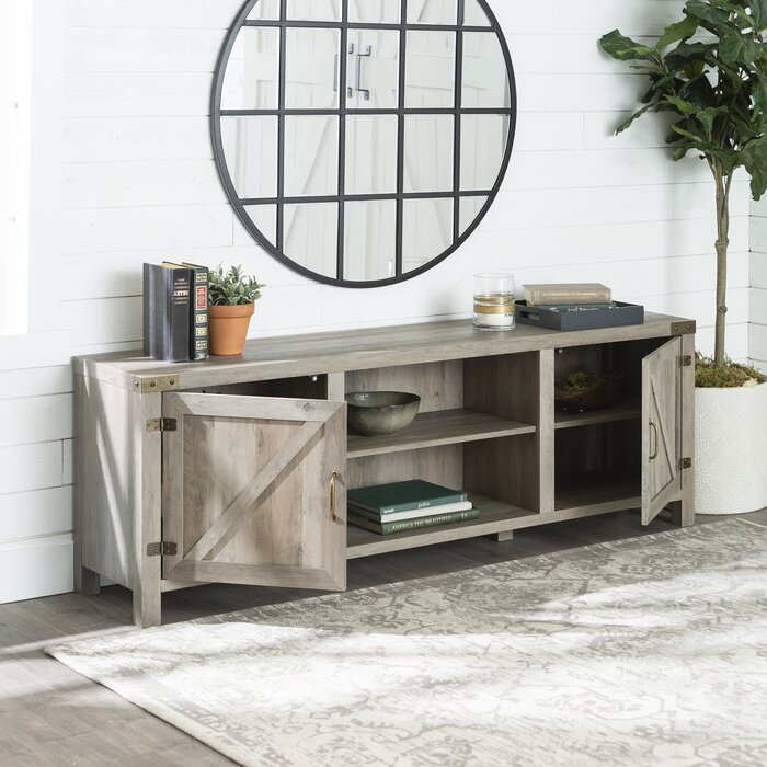 Lleve un pequeño estilo inspirado en un granero a la sala de estar con este soporte para TV, con capacidad para un televisor de hasta 78 ”. Hecho a mano con madera manufacturada, este soporte presenta puertas rústicas con patrones de vetas de madera, herrajes expuestos y una silueta aerodinámica para el aspecto de una moderna selección de granja. Un par de estantes abiertos ajustables le brindan lugares para exhibir reproductores de DVD y DVD que se ven con frecuencia, mientras que un par de cajones brindan aún más espacio para guardar su colección de accesorios de entretenimiento.