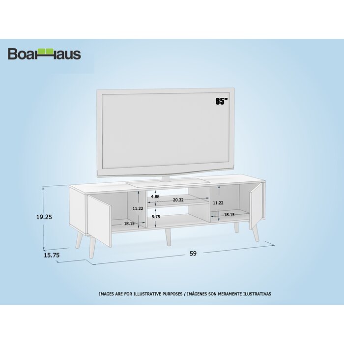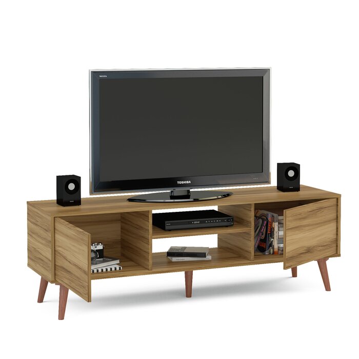 Este soporte para TV trae un diseño inspirado a mediados de siglo y una gran cantidad de espacio de almacenamiento adicional a su sala de estar. Está hecho de madera de ingeniería y tiene un acabado marrón neutro que deja ver la veta de la madera natural. Dos cubículos ofrecen almacenamiento fuera de la vista para sus juegos, libros o consolas. Los dos estantes abiertos le dan un lugar para la caja de cable y otros dispositivos electrónicos. Las patas cónicas y extendidas sostienen el soporte del televisor para darle una silueta retro. Mide 59 “de largo, por lo que puede adaptarse a televisores que midan 65” en diagonal.