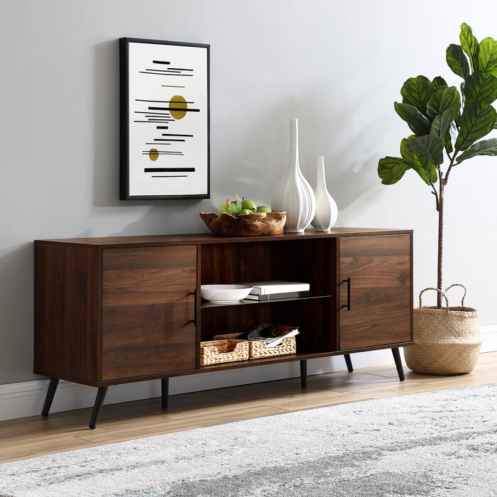Mejore su sala de estar con un soporte para TV con un estante de vidrio intermedio y almacenamiento cerrado en ambos lados para que tenga un lugar para sus elementos multimedia esenciales o decoración, ya sea en su sala de estar o dormitorio. Los elegantes herrajes de metal, las patas en ángulo y el marco cuadrado crean una estética moderna general de mediados de siglo. Con una función de administración de cables en la parte posterior para mantener las cosas ordenadas, estantes ajustables y pies de goma ajustables para evitar que se deslice, esta consola de almacenamiento será una adición práctica a su hogar.